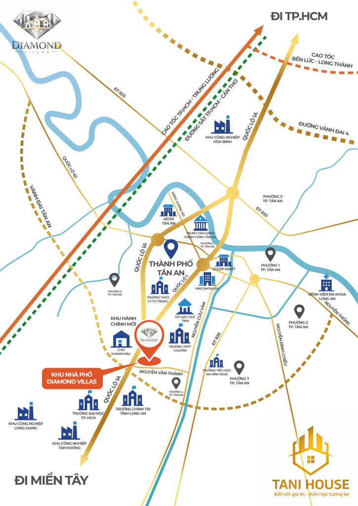 Khu nhà phố DIAMOND VILLAS tọa lạc ngay cạnh Quốc lộ 1A, chỉ cách trung tâm phường Long An khoảng 2km – vị trí vừa đủ riêng tư để an cư, vừa đủ sôi động để khai thác kinh doanh và đầu tư.